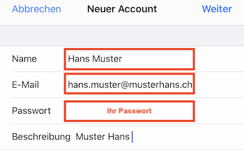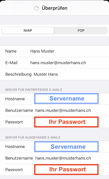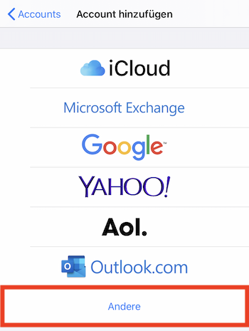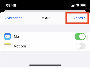 Nachdem die Account-Informationen überprüft wurden wählen Sie Mail aus und tippen Sie auf Sichern. Der Account wurde nun eingerichtet: